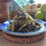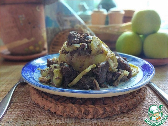 Поджариваем грудинку, добавляем к ней лук, жарим до золотистого цвета. Бросаем печень. Жарим примерно 7 -10 минут (пока кровь не исчезнет). Бросаем яблоки (у меня были сладкие, но я когда порезала, добавили 1 ч. л. яблочного уксуса).