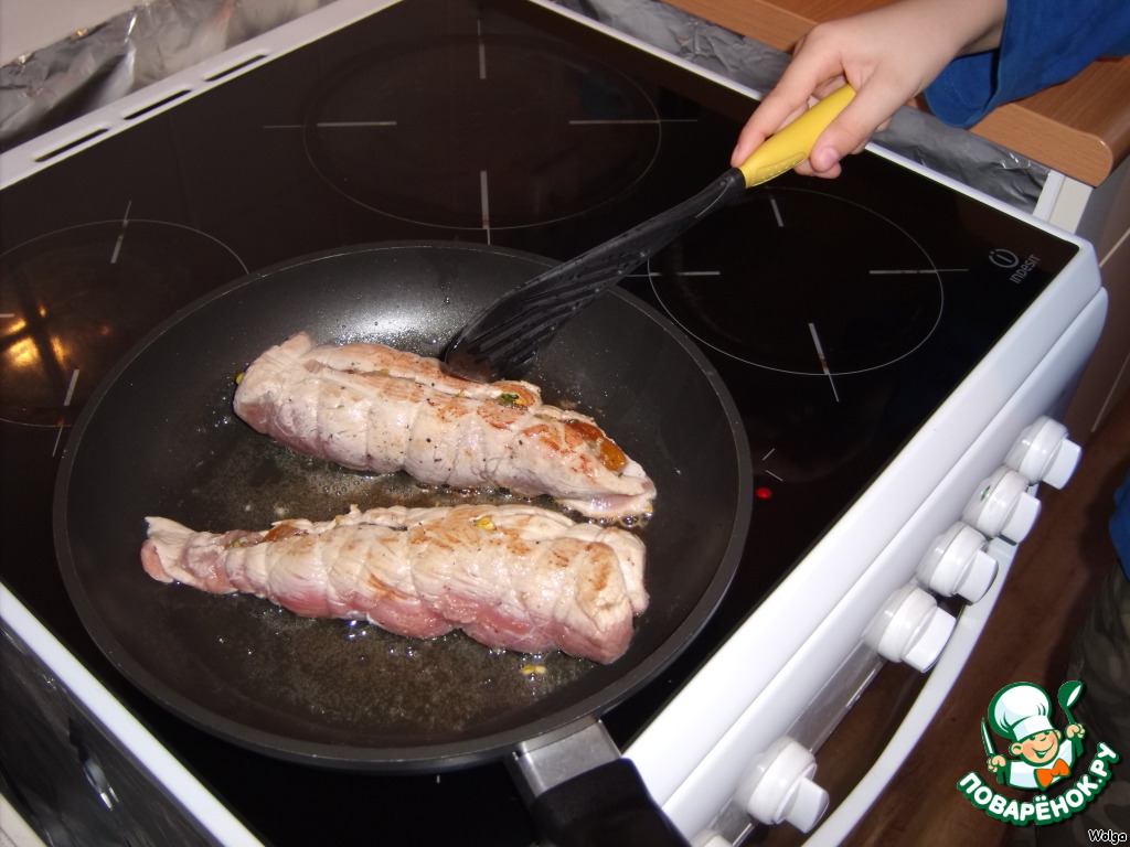 Разрезать свиную вырезку вдоль, чтобы она открылась, как книжка.
