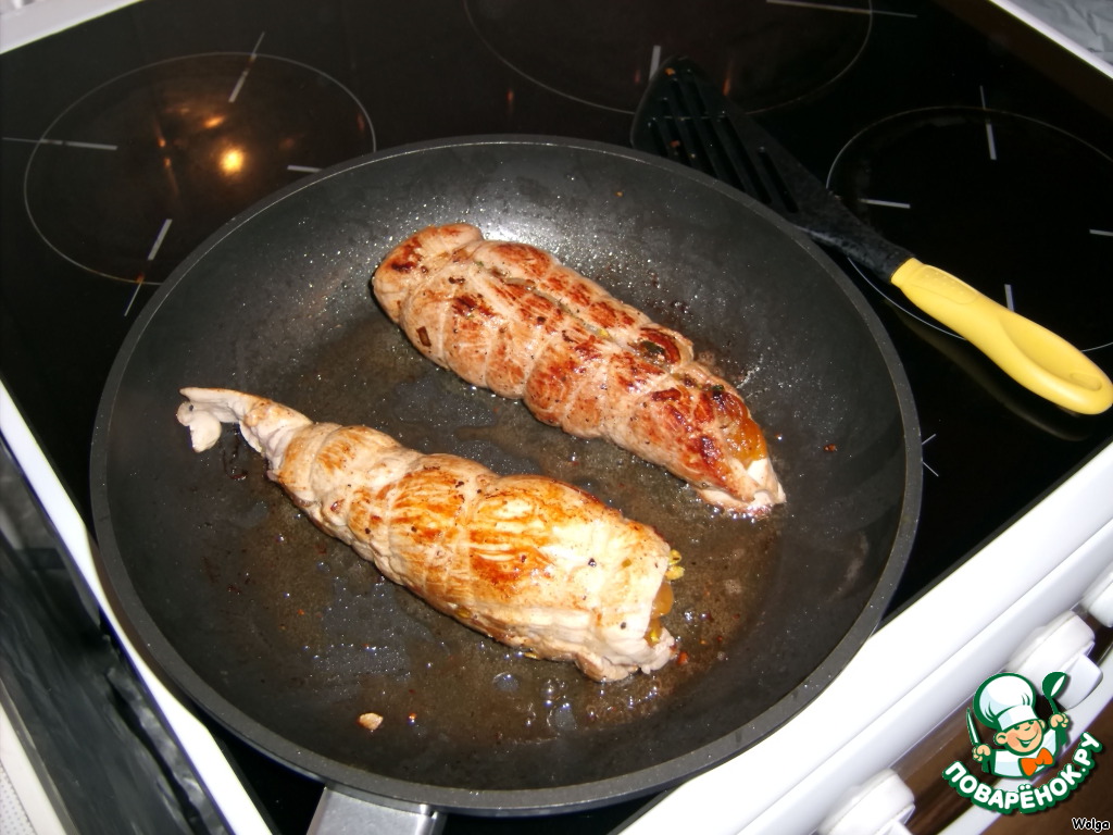 Разогреть оставшееся оливковое масло и сливочное масло на сковороде. Обжарить рулеты со всех сторон до румяной корочки. -