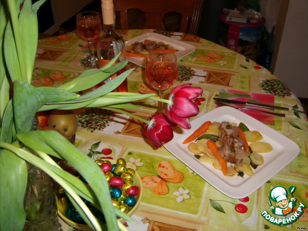 Тем временем для гарнира поставим отваренные до полуготовности молодые весенние овощи и картошку в духовку.