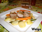 Осталось накрыть на стол, нарезать рулетики, предварительно удалив нитки, выложить красиво на овощи и полить образовавшимся от жарения соусом.