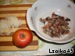 Яблоко трём на тёрке. К селёдке добавляем лук, яблоко