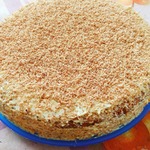 Корж разрезаем на 2 – 3 части, пропитываем смесью ликера (или сиропа) и воды, взятых в одинаковом количестве. И укладываем в стандартном порядке: корж – крем – корж – крем. Сверху у меня посыпан нарезанным шоколадом.