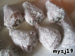 Подготовленные голени панируем в муке. Оставляем минут на 5, а затем панируем во второй раз.