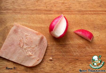 В центре редиски сделать поперек надрез - не до конца. Из плавленного сыра вырезать два кружка и в ставить в эту прорезь - это ушки.