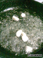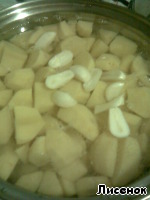 Картофель чистим, мелко режем и отвариваем в подсоленной воде вместе с дольками чеснока.