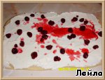 Подошедшее тесто раскатать в прямоугольный пласт толщиной 1,5 см, промазать творожной массой и выложить сверху вишню. -