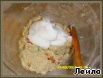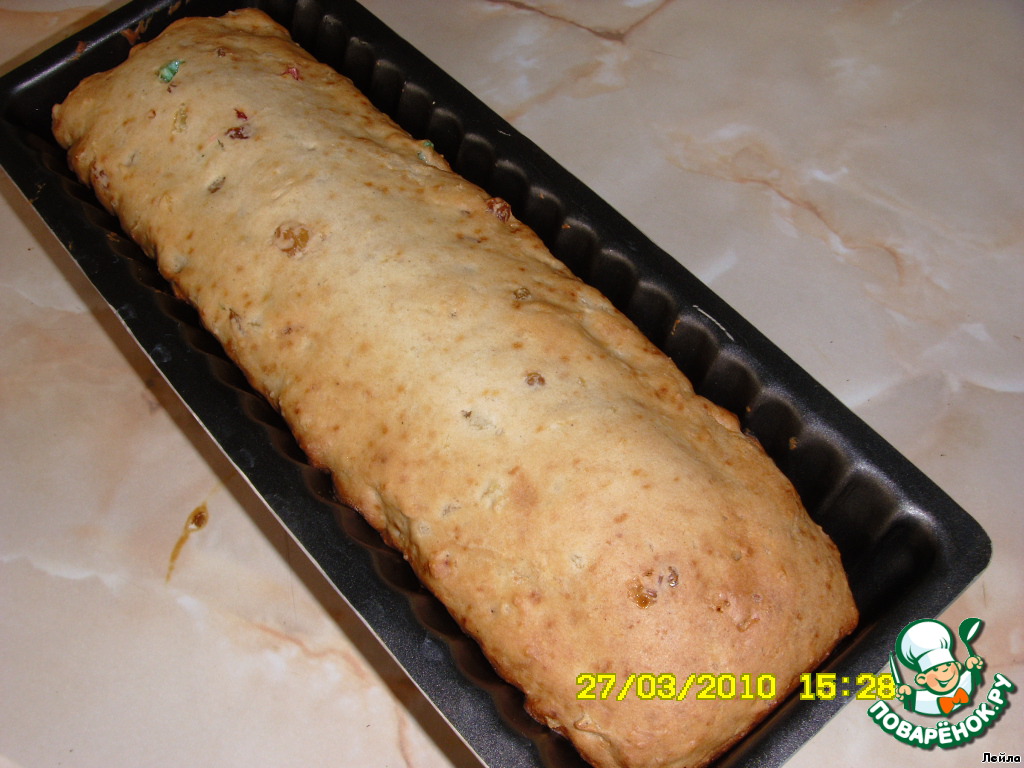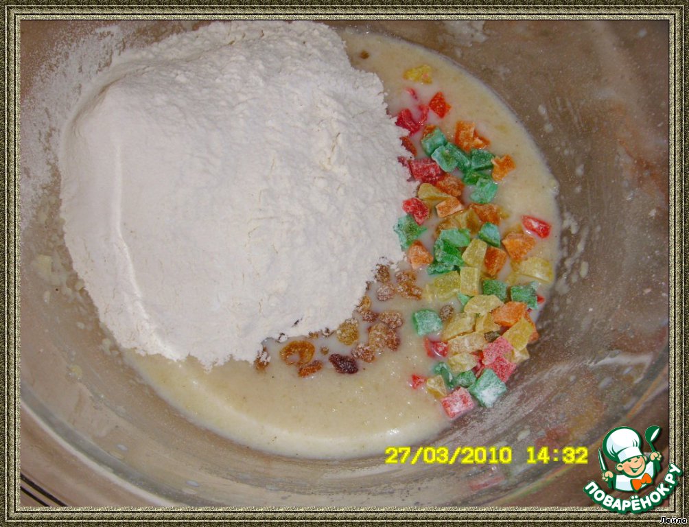 И муку с разрыхлителем, слегка вымесить. Нарезала и добавила цукаты (размером с изюм) и изюм