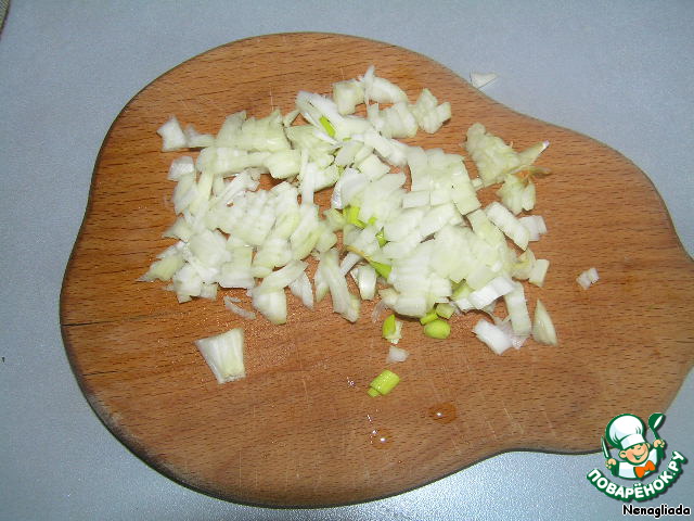 • 2. Лук нарезаем мелкими кубиками. Ставим чугунную посуду на огонь, разогреваем масло. Пассеруем лук.