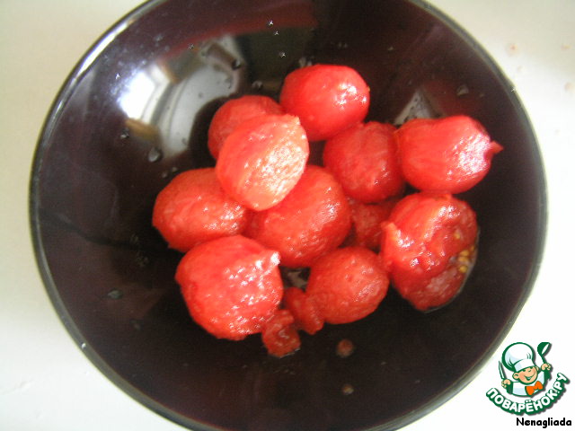• 4. Консервированные помидоры освобождаем от кожицы (сливки не подойдут - у них кожица не отделяется). Внимание: помидоры должны быть не очень кислые и приятные на вкус, иначе блюдо будет испорчено.
