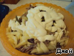 Затем соединяем все наши исходные продукты - картошку, язык, лук, соль, перец, приправы, лавровый лист, майонез