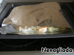 10. Приминаем фольгу, прислоняя её к массе внутри (так рыба будет готовится с своем соку и хорошо запечется от раскаленной фольги). Следим, чтобы углы не оставались пустыми - загибаем их - чтобы в них не скапливался драгоценный сок. Фольгу желательно проколоть в нескольких местах сверху для возможности выхода пара