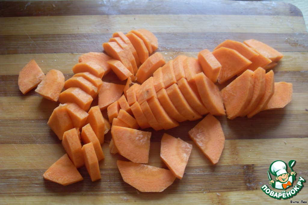 Морковь чистим, режем кусочками, можно закладывать в кастрюлю сразу сырой,