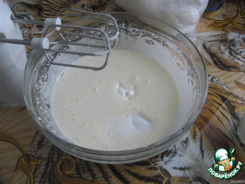 Яйца хорошенько взбить с сахаром, добавить растопленный маргарин, сметану, соду, соль (я не использовала, забыла), ванилин. Еще раз взбить.