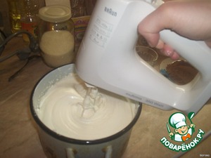 сметану взбить; затем, продолжая взбивать, небольшими порциями ввести 1,5 стакана сахара (можно добавить щепотку ванилина).