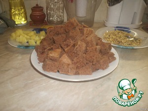 От готового остывшего бисквита отрезать корж высотой 1,5-2 см, а оставшуюся часть нарезать кубиками в 3-4 см.