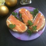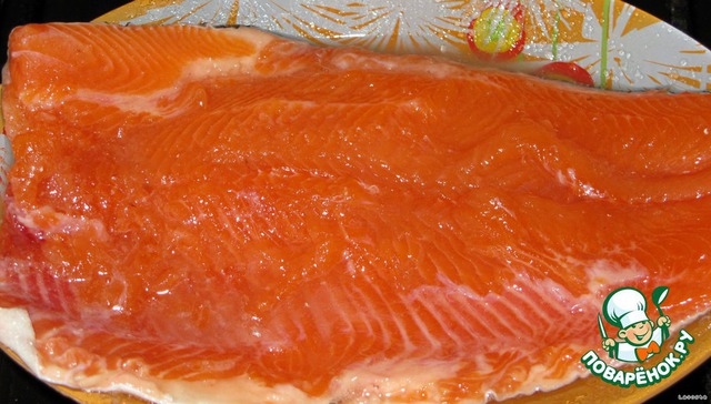 Филе красной рыбы подготовить, освободить от мелких косточек. Натереть смесью из соли и сахара (на 0,5 кг филе: 2 ч. л. соли и 1 ч. л. сахара)