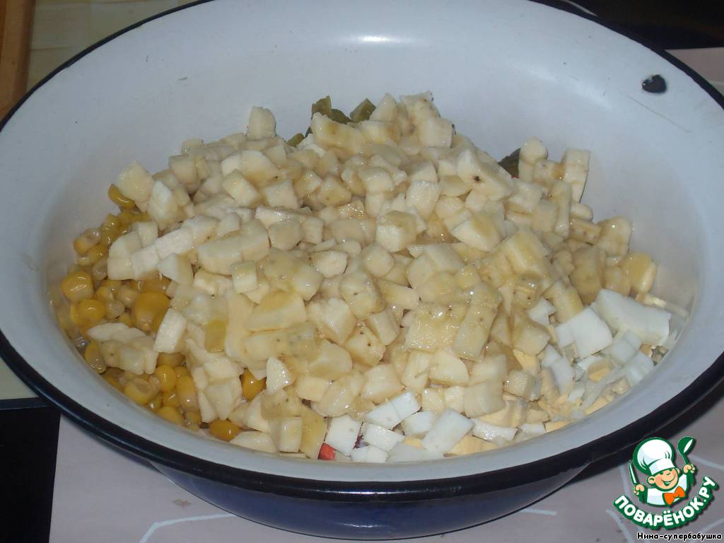 Бананы тоже нарезать маленькими кубиками и всыпать в салат.