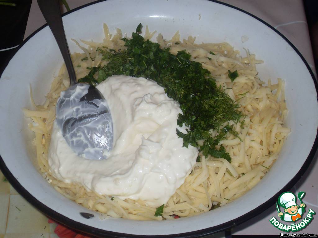 Чеснок очень мелко нарезать ножом (!) и смешать с майонезом.