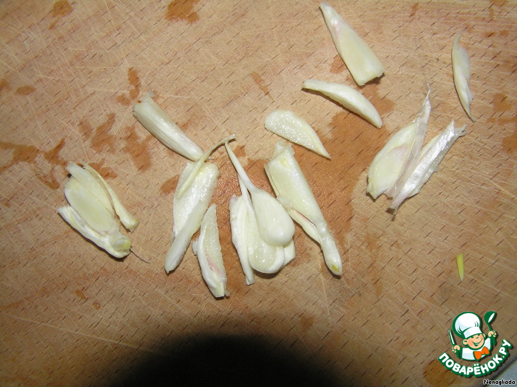 • 3. Зубчики чеснока нарезать вдоль тонкой соломкой.
