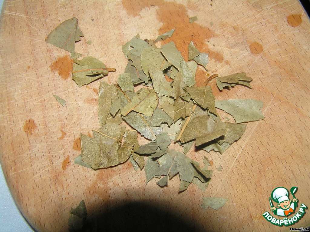 • 6. Выложить лавр венком вокруг грудинки (так его будет проще снять после приготовления, так как мелкий лавр неприятен при попадании при еде).