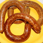 4. На трубочку одеть "гармошкой" кишку и начать начинять не очень туго, чтобы не лопнули. Когда наполнили кишки мясом, завязать сначала по средине, а затем концы. Иглой сделать много частых проколов, чтобы выпустить воздух и чтобы при запекании не лопнула.