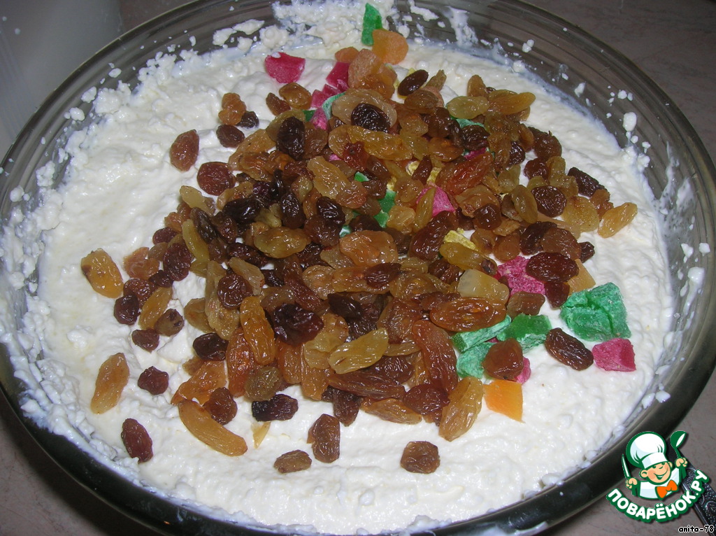Добавить заранее вымытый и обсуженный изюм, цукаты. Осторожно перемешать!