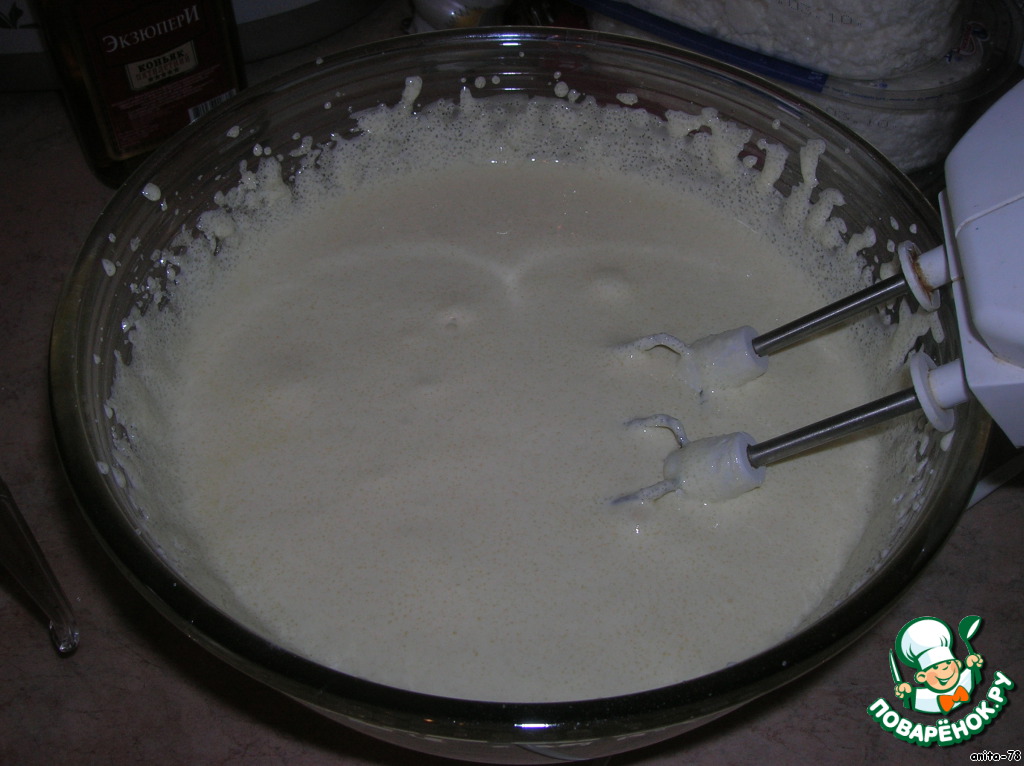 Хорошо взбиваем желтки с сахаром и ванилином. Добавляем теплое молоко, коньяк.