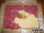 Начинаем собирать наш тортик: пропитываем фруктовым сиропом (вода+вишни+сахар довести до кипения и варить 5 мин.), у меня был вишневый, поэтому бисквит приобрел красивый малиновый оттенок. Можно использовать любой сироп по желанию.