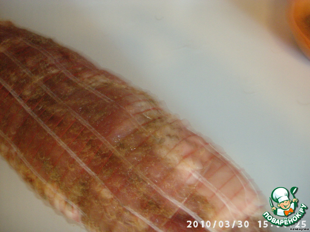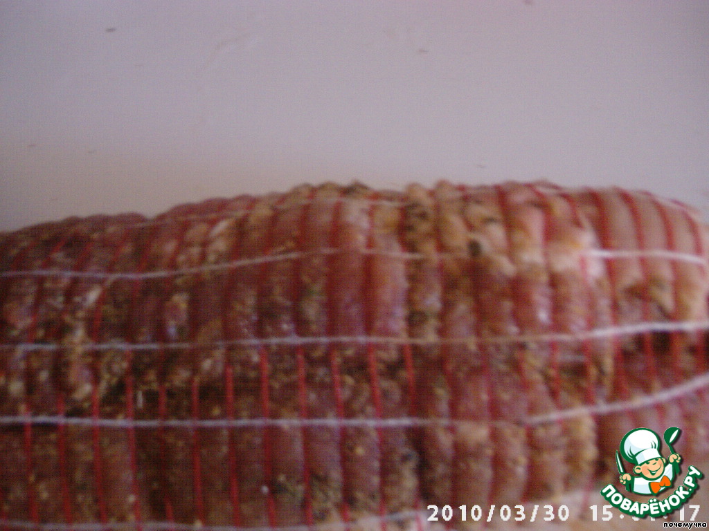 Потом подготовленный свиной бок сворачиваем в рулет, закрепляем шпагатом и надеваем сверху сетку.