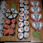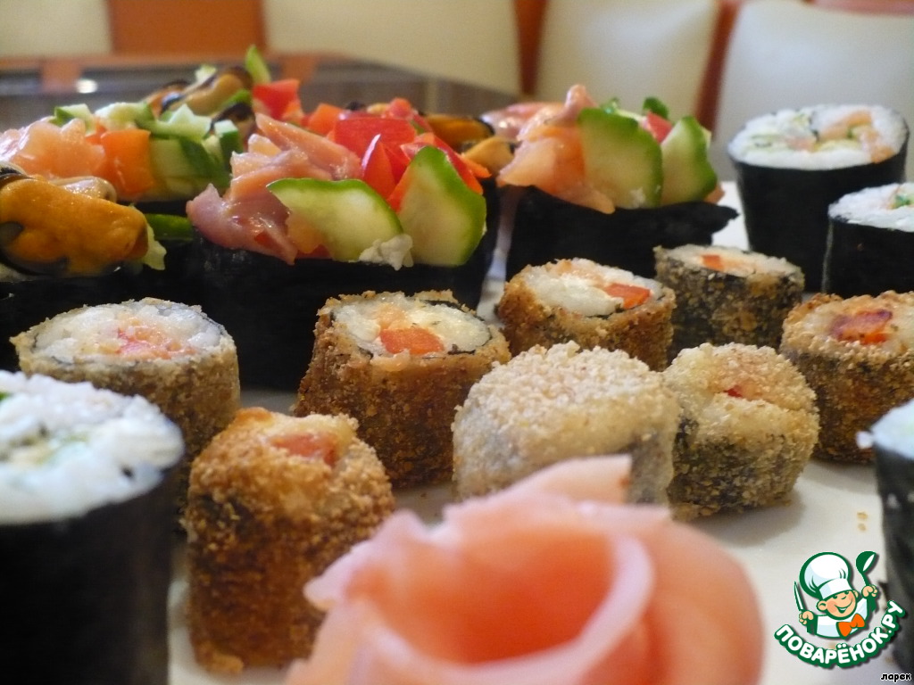 Гинкан-маки, темпура-маки, сяке темари суши и ролл "Мозаика". А теперь по-русски. Гинканы - лодочки, темпура - горячие роллы, сяке темари - рисовые шарики с лососем. Это не сложно! А горячие хрустящие роллы в темпуре оценят все без исключения.