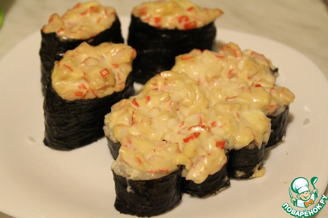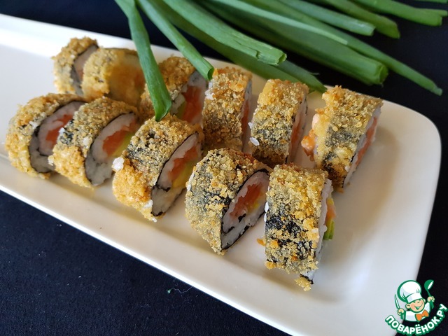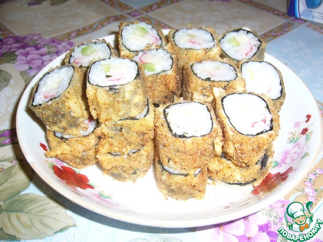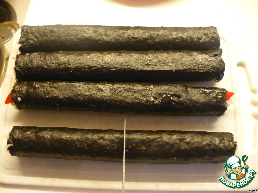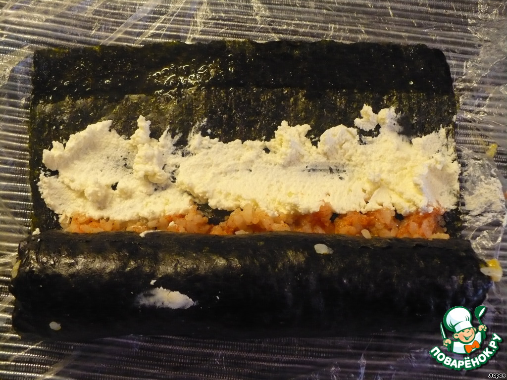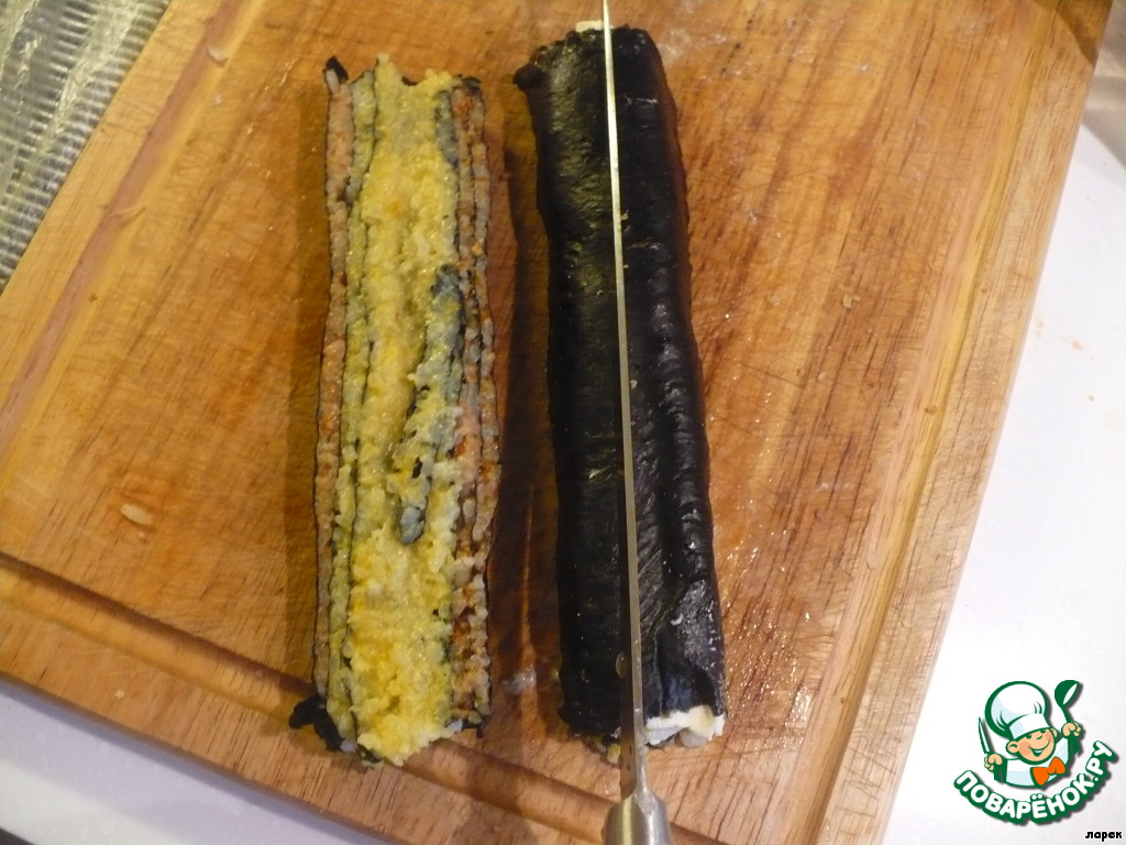 Сворачиваем самый обычный ролл "улиткой". У меня не хватило риса, поэтому в конце добавила сыр.