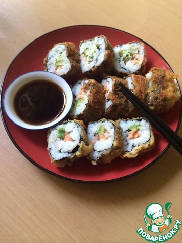Теперь - самое вкусное, на мой взгляд, - темпура маки или горячие роллы в темпурной муке. Это в идеале, но и обычная мука (как в моем случае) подойдет. Из половины листа нори сворачиваем роллы. Начинка та же, что и в случае с гинканами. Единственное отличие - поскольку роллы делаем из половины листа, то и полоски начинки должны быть тонкими и не более 3 компонентов (к примеру: огурец, Альметте, креветка), и рис выкладываем тонким слоем - в 2-3 рисинки. Можно делать роллы и на всю длину, но я люблю маленькие, на один укус.