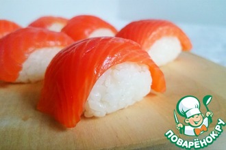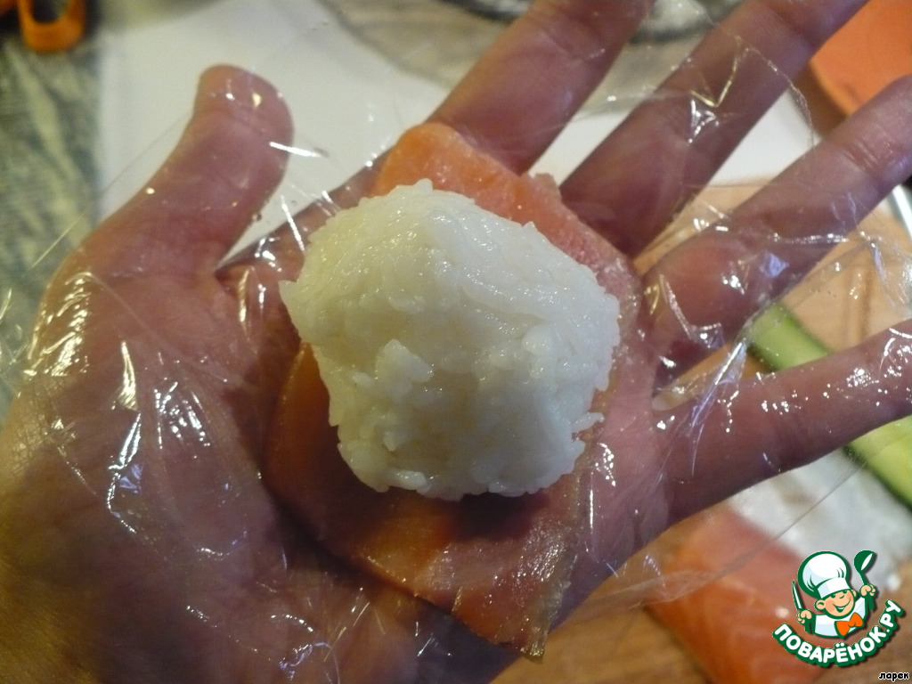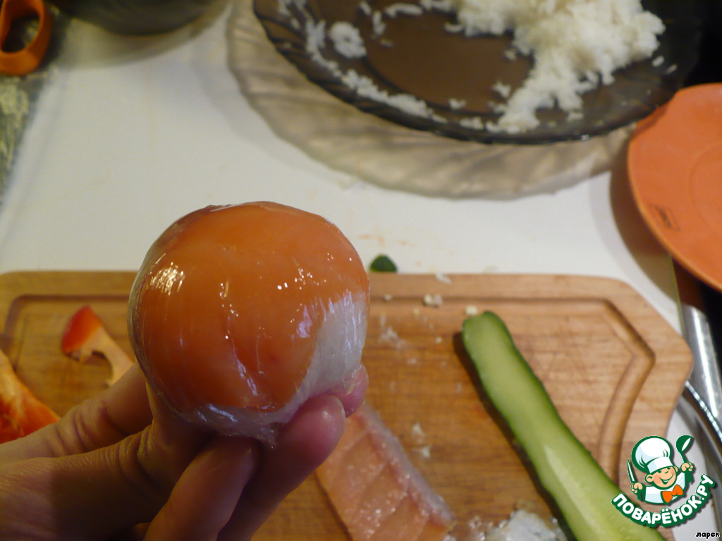 Ну и самое простое - сяке темари суши или суши-колобки с лососем. Если рис остался, а водоросли закончились, берем лист пленки, кладем пластину лосося, рис,