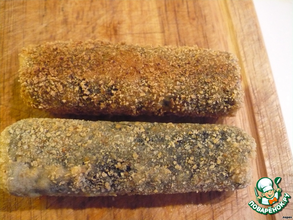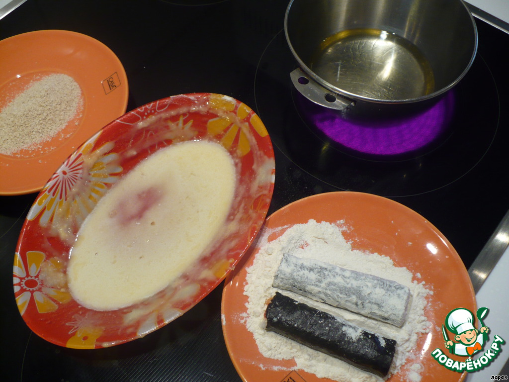 Теперь готовим 3 блюдца: в первое насыпаем муку, во второе - панировочные сухари, в третьем готовим обычный кляр из одного яйца, муки и ледяной воды (я просто достала кубик льда и немного подождала, пока растает). Кляр должен быть по консистенции как на оладьи. Темпура-маки едят горячими, поэтому готовьте кляр непосредственно перед подачей на стол. Итак, разрезаем роллы пополам, обваливаем в муке, затем в кляре и в последнюю очередь - в панировке.