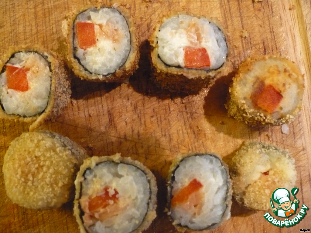 Разрезаем. Рекомендую их тоже обжарить в кляре перед тем, как разрезать. По причине - слишком много риса, но мало начинки. Будет вообще бомба - и красиво, и вкусно, и оригинально