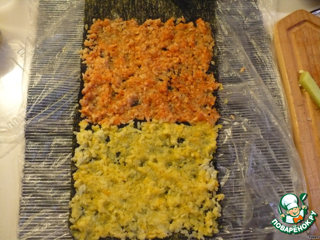А теперь - самое красивое - мозаика. Делим рис на 2 равные части. У кого есть икра летучей рыбы и черный кунжут, могут смешать каждую из этих частей с данными компонентами. Я же одну часть окрасила в куркуму, вторую - в паприку. Берем два листа нори, выкладываем по длине друг за другом, края склеиваем при помощи воды. На первый лист выкладываем желтый рис, далее - красный. Не смогла найти свой бамбуковый коврик, дочка куда-то "заиграла", поэтому пришлось в пакет положить плотную салфетку.