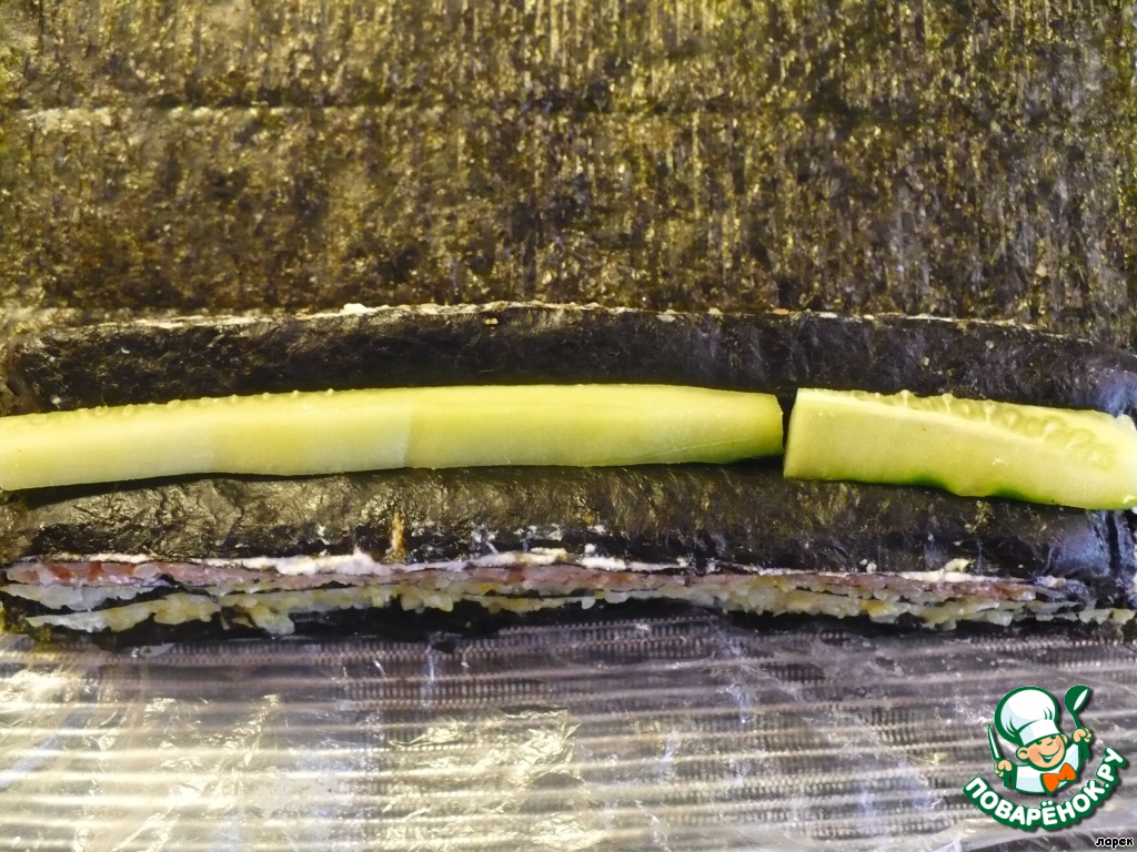 Берем еще один лист нори, на него кладем 2 части ролла нори вверх - между ними образуется ложбинка - туда огурец, желательно, среднюю часть брусочком, чтобы в разрезе получился квадрат. Можно положить тунец или семгу.