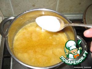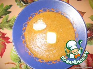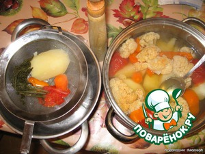 Получается вот такое пюре. Его мы заправляем оставшимся овощным бульоном, на плите доводим до кипения.