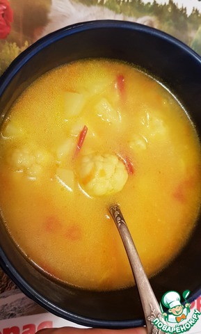Для приготовления данного овощного супа чистим картофель и морковь, веточки капусты отделяем от основного ствола, томаты режем пополам, у перца удаляем плодоножку с семенами, зелень промываем. Складываем в кастрюлю и заливаем водой. Доводим до кипения, убавляем мощность плиты до 1/3, продолжаем варить в течение 25-30 минут. Соль добавляем в самом конце. Цветную капусту можно заменить чем угодно. Я готовил данный суп и с брокколи, и с кабачком.