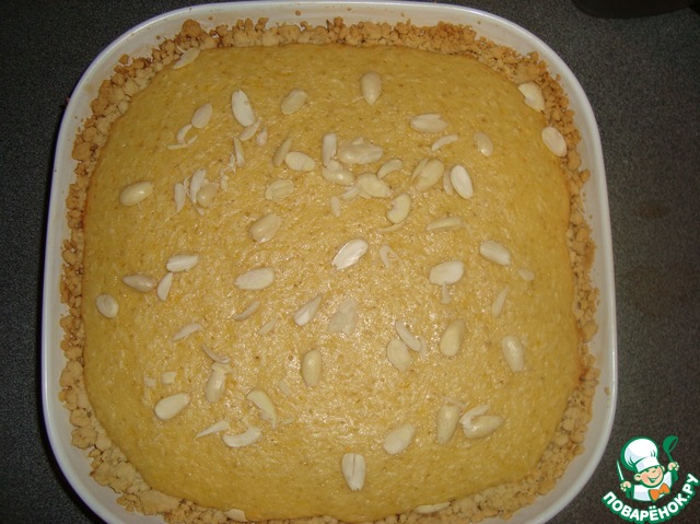 Тесто распределить руками по всей площади формы и поставить выпекать в нагретую до 180 град. духовку минут на 15, до золотистого цвета. -