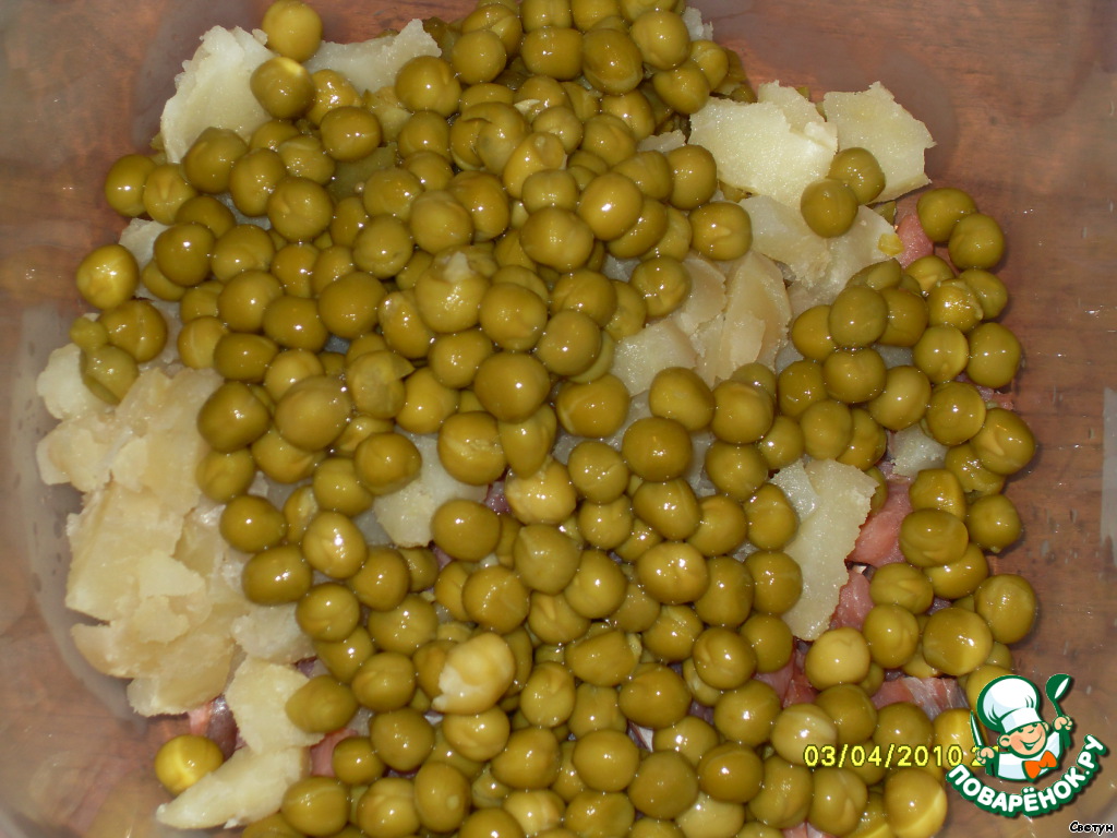 - Горошек зеленый (маленькая баночка) — 1 бан.