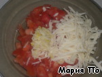 Сыр натираем на крупной тёрке, чеснок на мелкой. Добавляем к помидорам. Перемешиваем. Немного солим и перчим.