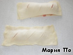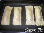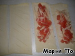 Тесто раскатываем на прямоугольники. На один пластик выкладываем нашу начинку.