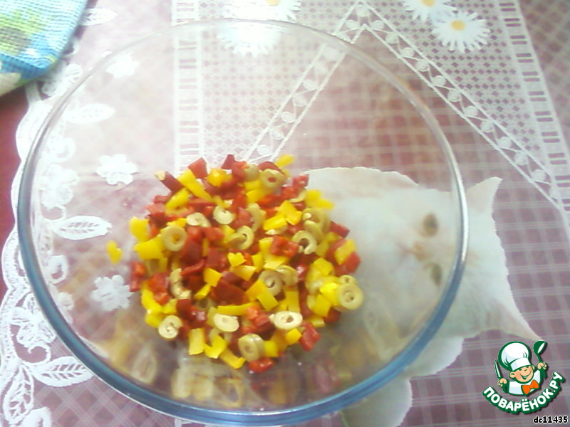 • Перец нарезаем небольшими кубиками, оливки кольцами и замачиваем все в рассоле от оливок на 15 мин. Отжимаем и выкладываем в салатник.
