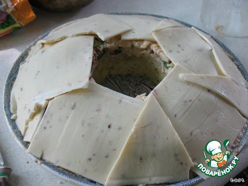 • Теперь вынимаем аккуратно стакан. 7 ломтиков тостового сыра раскладываем по кольцу салата, стараясь по возможность укутать его полностью.