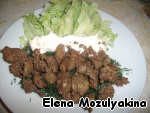 На укроп положить печенку. Между салатом и печенкой положить чесночный майонез.