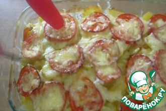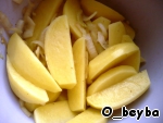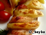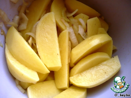 Кладём картофель (тоже без лука) в разрезы мяса и рядом.