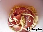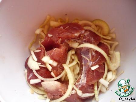 Лук режем полукольцами. Солим, перчим. Помнём лук руками. Кладём лук поверх вырезки и аккуратно всё перемешаем. Накрываем пищевой плёнкой и ставим в холодильник. Я оставила на ночь, но можно и часика на два.