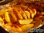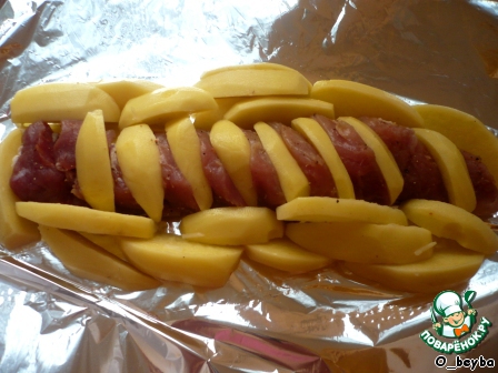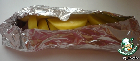 Когда мясо замариновалось, кладём его на фольгу. Только без лука. Картофель режем.